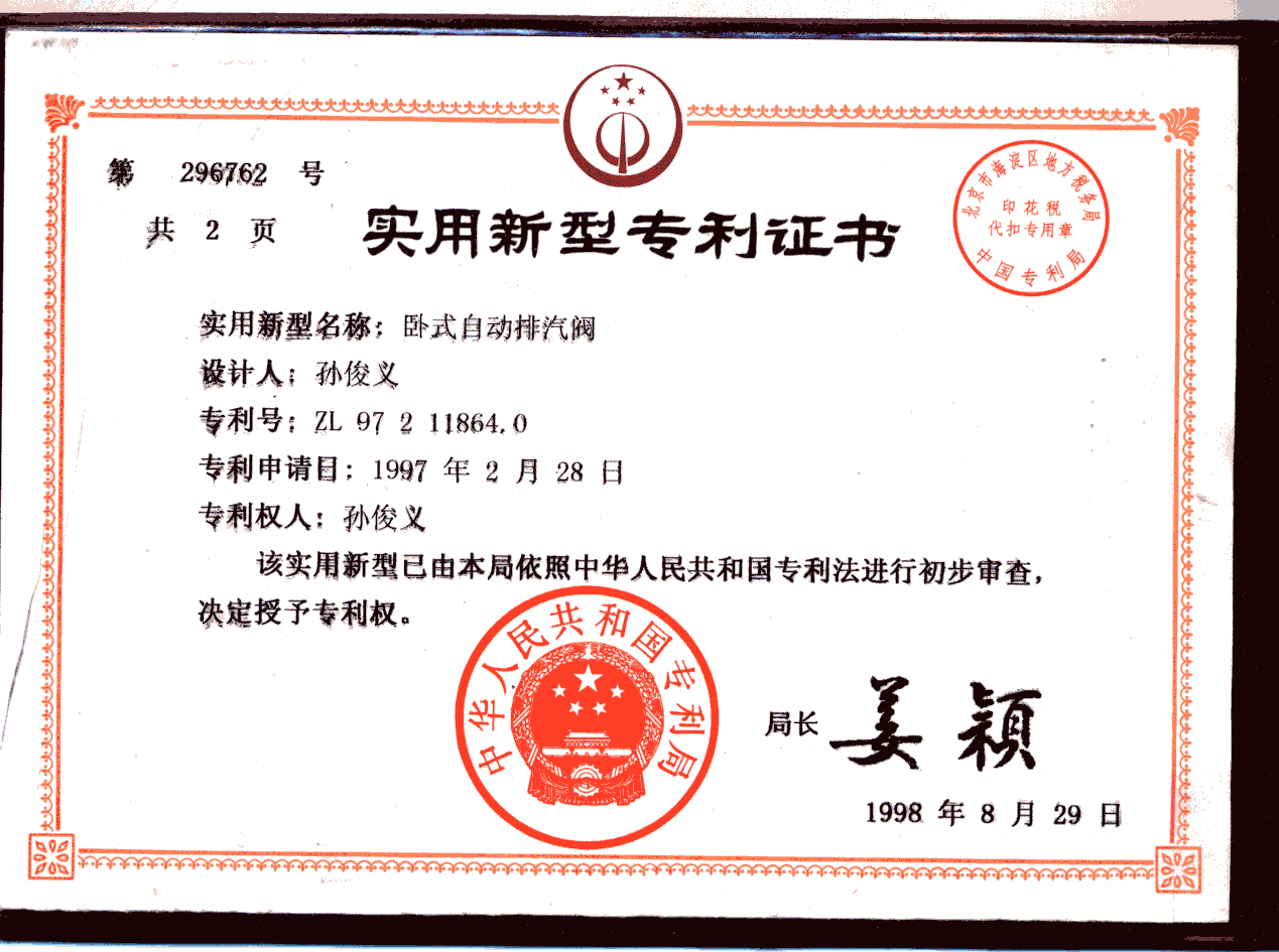 曾荣获卧式自动排汽阀实用性专利