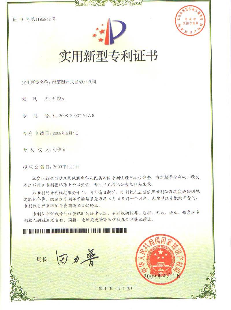 曾荣获滑塞撬开式自动排汽阀实用新型专利