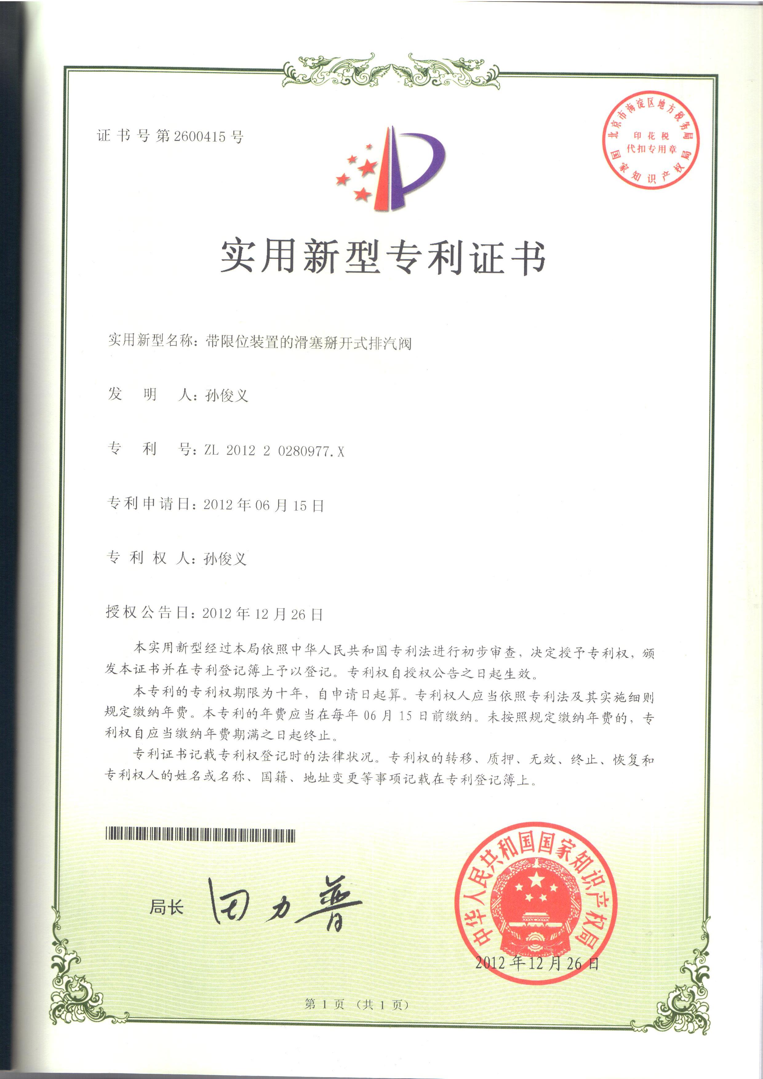 曾荣获带限位装置的滑塞掰开式排汽阀实用新型专利