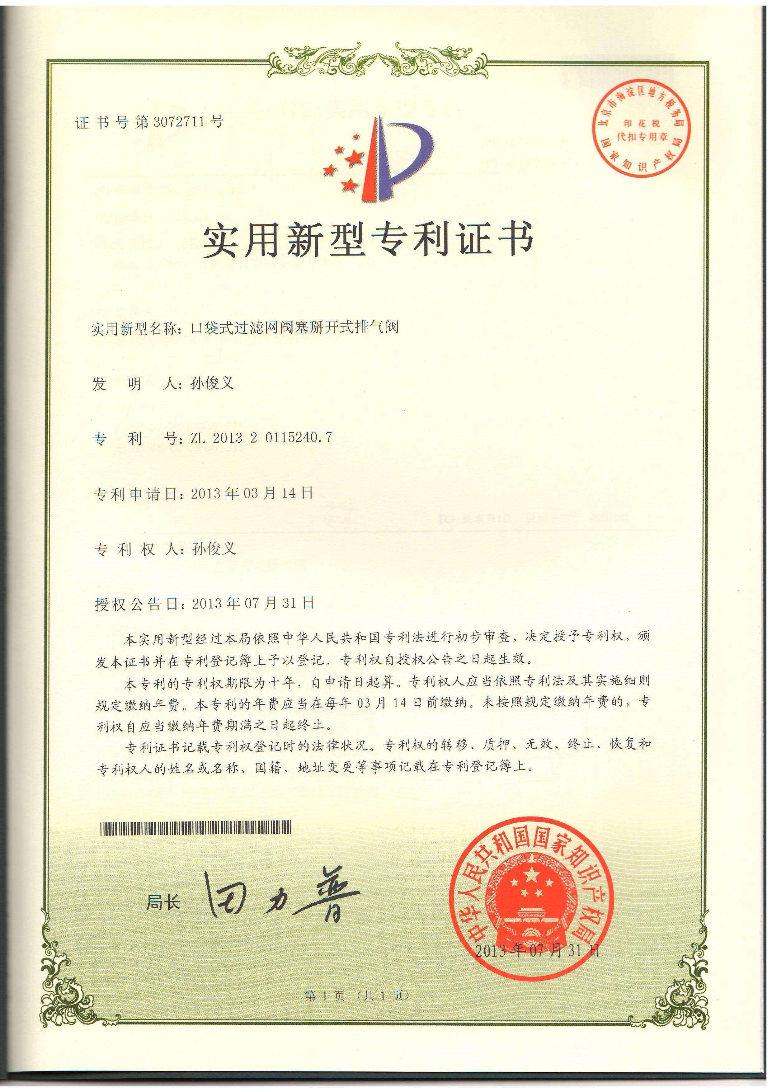 曾荣获口袋式过滤网阀赛撬开式排气阀实用新型专利