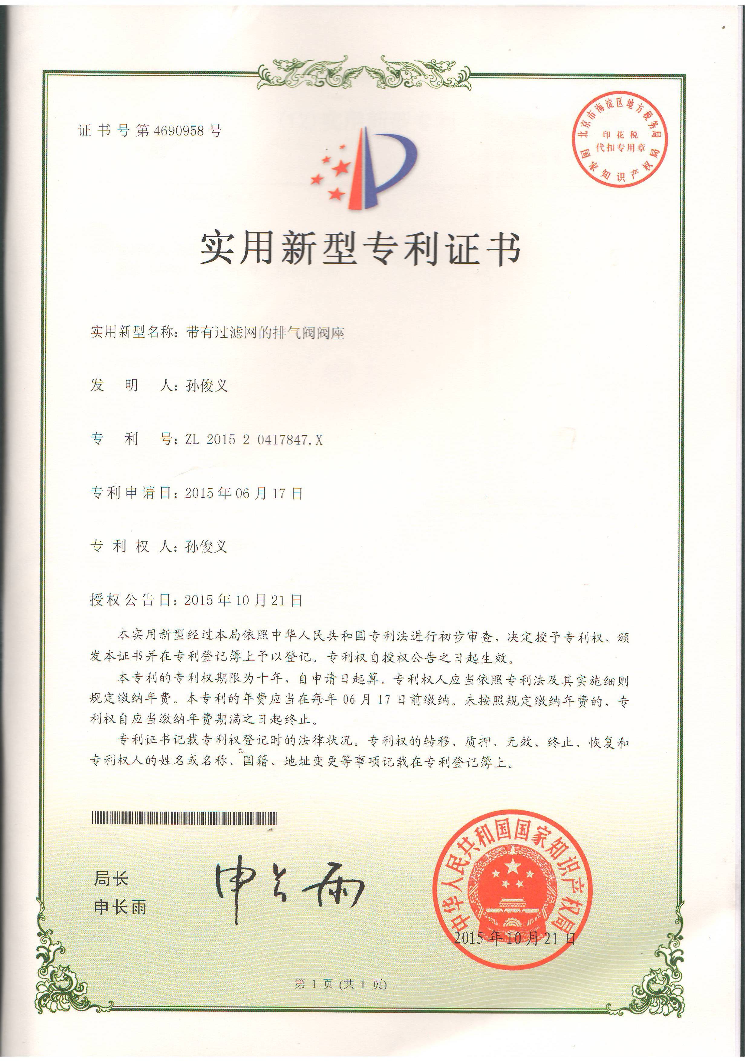 曾荣获带过滤网的排汽阀阀座实用新型专利